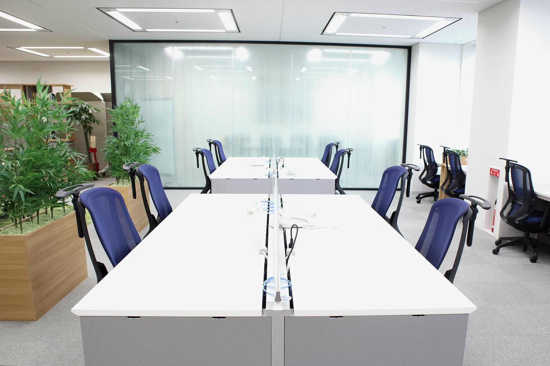 避難距離を確保する観点から、居室を作ることが難しい区画への入居でしたが、計画当初から消防法を遵守するレイアウトを検討・提案させていただきました。間仕切りによる仕切りが難しいため、什器によって通路や会議スペースを構築しています。