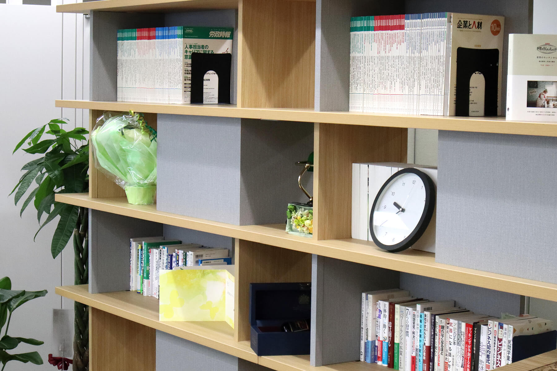 会議室までの動線にはハイシェルフを設置し、廊下部分はカーペットを張りかえることで、一つの広い空間としても感じられるよう、執務エリアと来客エリアをゆるやかに仕切りました。また、ハイシェルフには、業務上よく利用するという本やデータ資料、絵画や音響機器を設置することでセレブレイン様らしさを感じられる空間となりました。