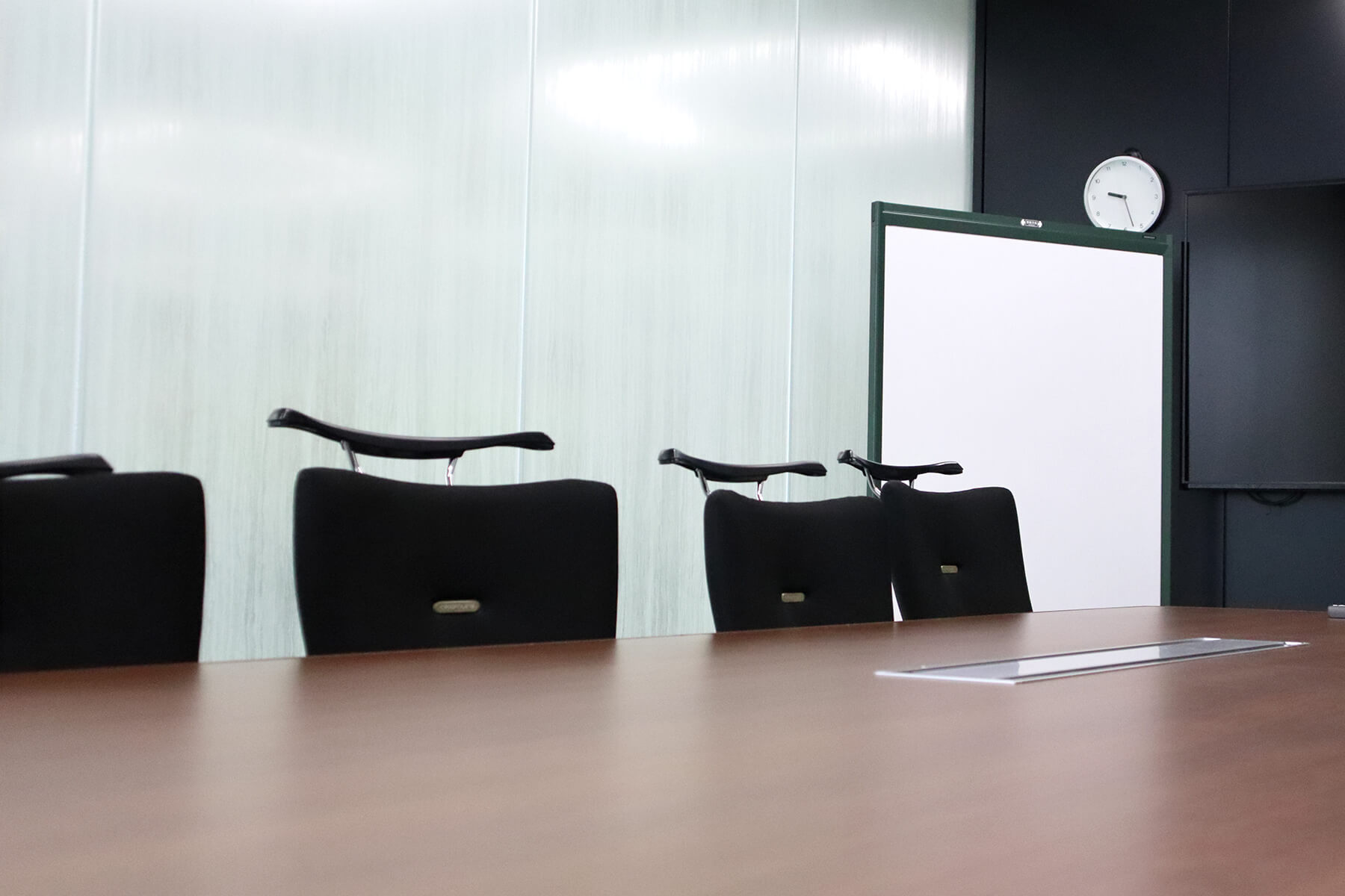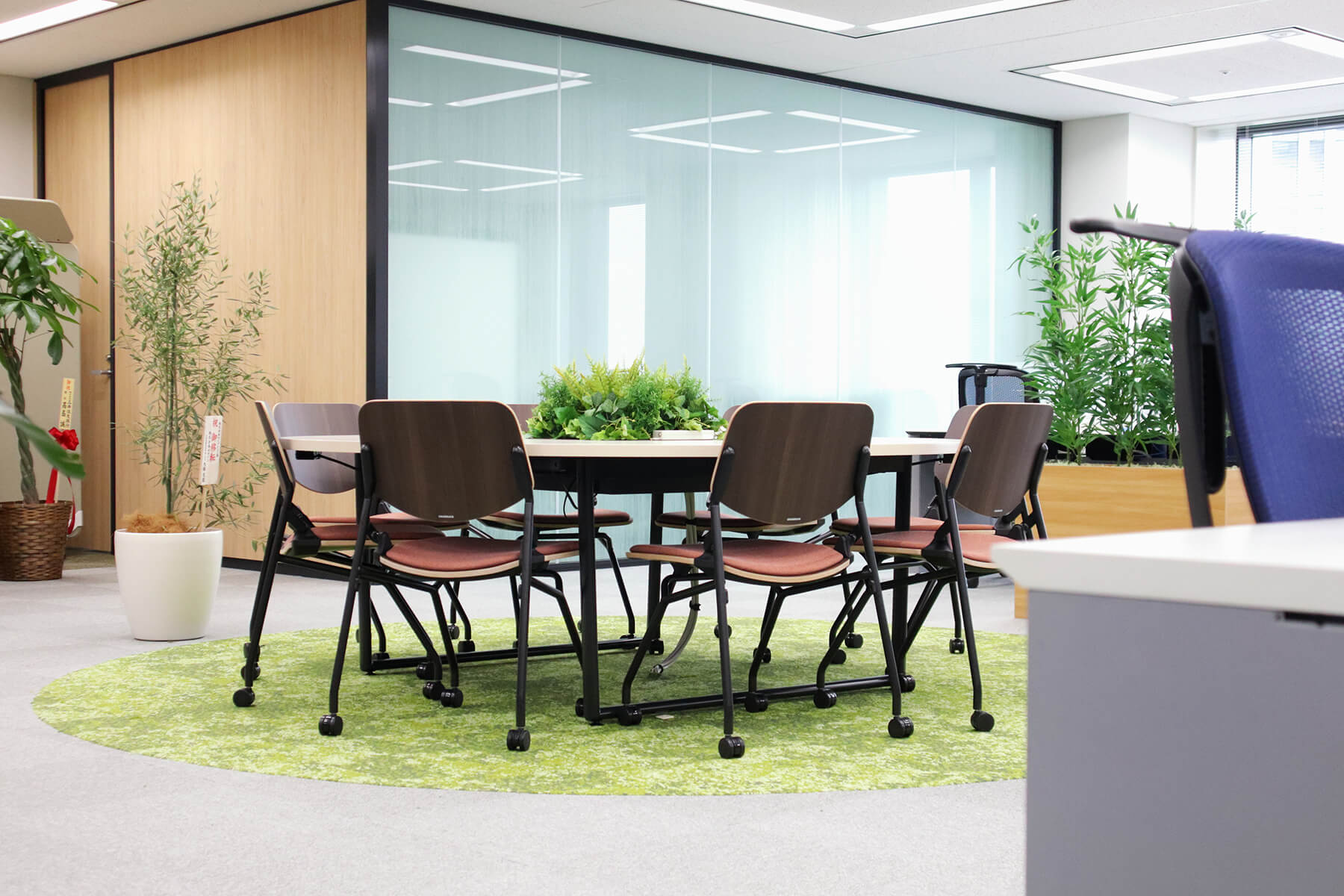 来客エリアの内装に関しては、エントランス・会議室ともにウッド調をベースにしながら、コーポレートカラーであるグリーン調の色彩を取り入れて、スタイリッシュかつあたたかみのある空間をつくりあげることができました。