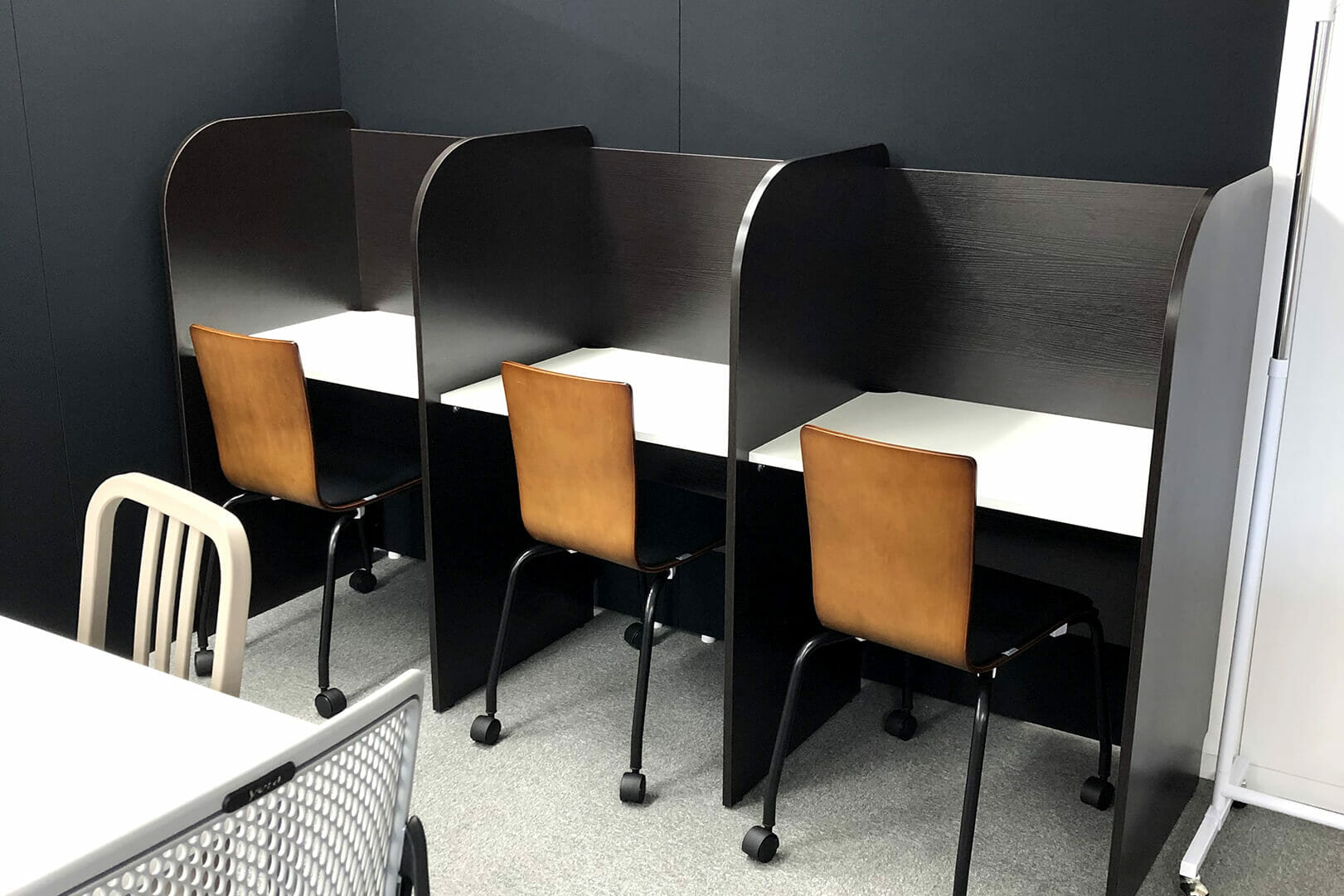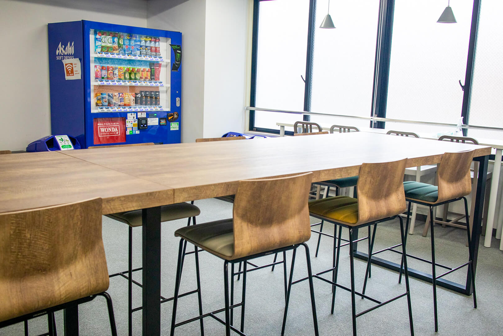 ソロ席・複数席、ハイテーブル、移動席など、複数種類のツールえを用意した空間は、リフレッシュスペースだけでなく社内ミーティングや集中作業など、多目的に使用でき、従業員のみなさまから好評をいただいています。