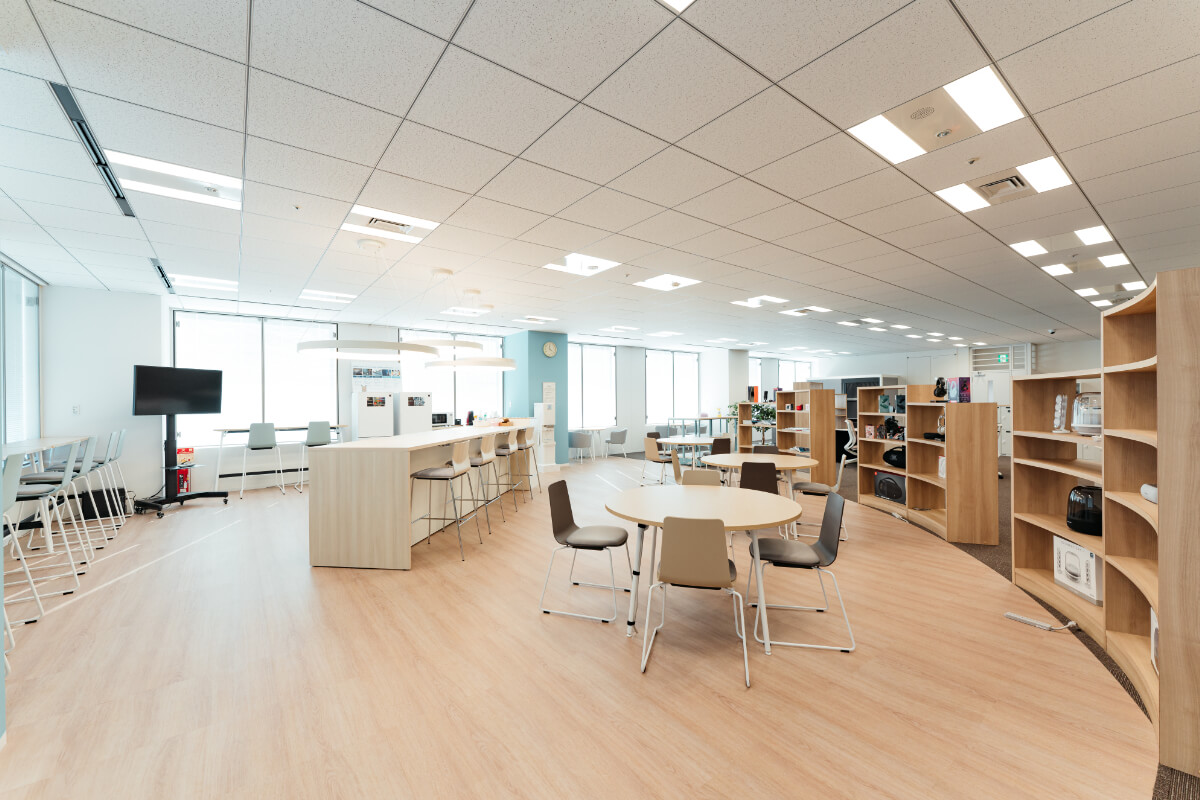 大きい窓面から海がよく見える立地を生かして、執務室内の一角をリフレッシュエリアといたしました。柱を空色に塗装し、照明も雲をイメージしたペンダントライトを入れることで、空と海を感じることのできるカフェのような空間にいたしました。床は木目の塩ビタイルにすることで、掃除がしやすい実用性と木目のあたたかみのあるデザイン性を兼ね備えたスペースになっております。