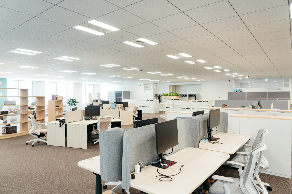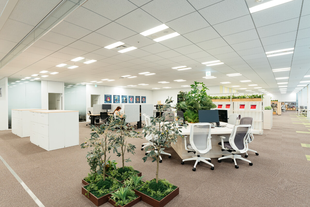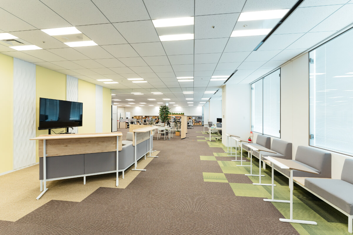 まず執務室内には間仕切りをたてず、作業ゾーンとコミュニケーションゾーンが連続的に配置いたしました。物理的な仕切りのない開放的なスペースは、創造的な発想や新しいアイデアの発生を促進することができ、ここで働かれる方々が自由に交流できる場を提供します。