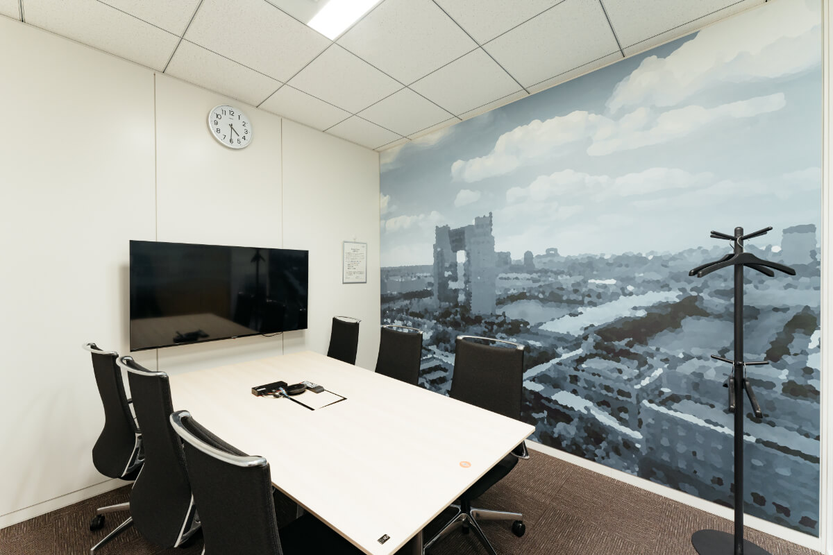6名用の会議室は窓面がないため、廊下側の間仕切りはガラス間仕切りとして空間に広がりを持たせるようにしました。また、壁の一面には、執務室内のリフレッシュエリアから見える景色をグラフィック化し壁紙にいたしました。