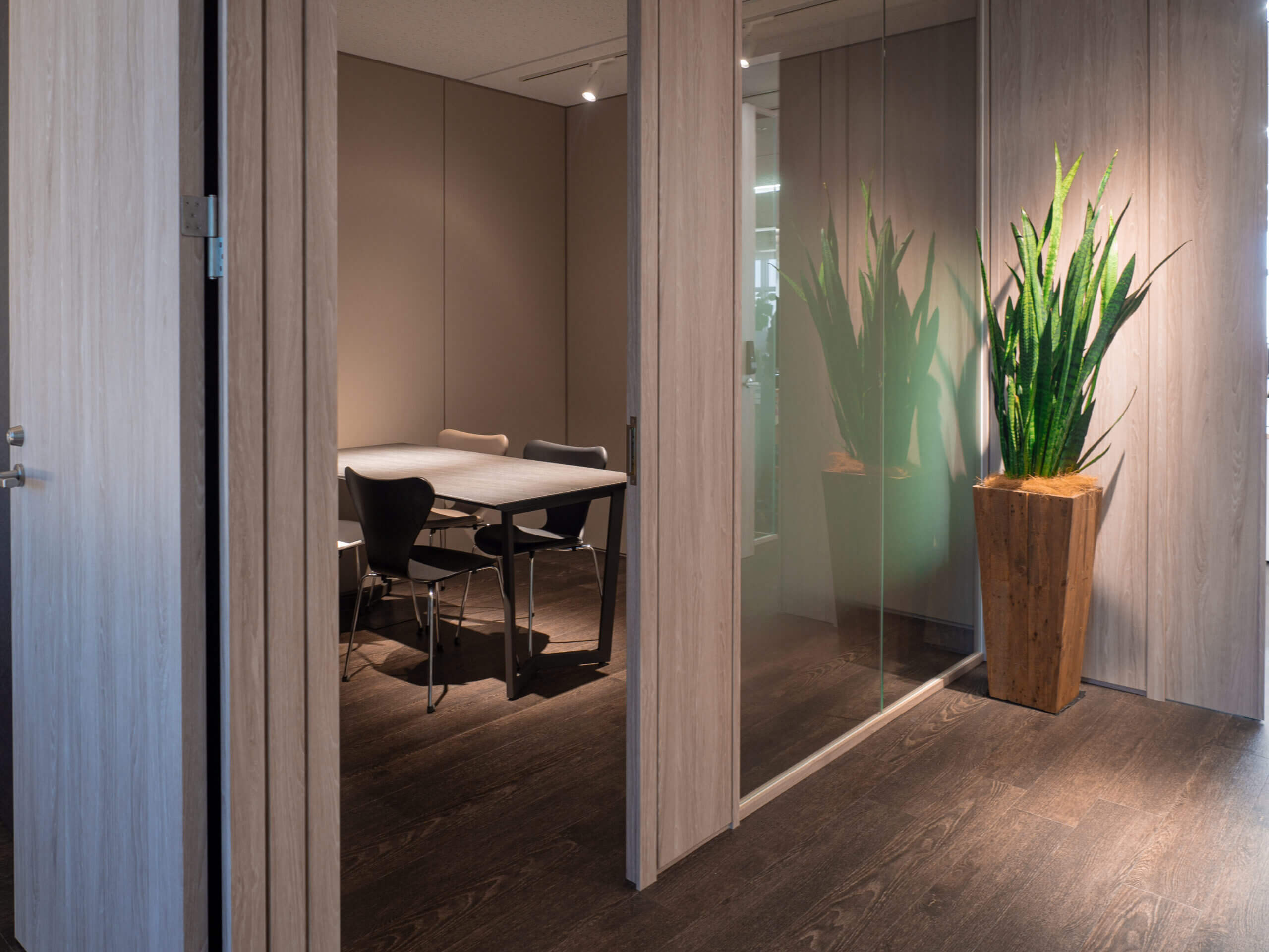 什器はお客様にてご選定・ご手配いただきましたので、そちらのカラーや素材に合わせた内装材をご提案致しました。トーンを抑えた落ち着いた色味ながらも、素材感のあるフィルムを用いることで高い意匠性を感じる演出をしております。オフィスに訪れた方々をお迎えするエントランスから廊下、会議室内までの空間全体に統一感のあるデザインを施すことで、一貫したコンセプトが感じられる洗練されたオフィス空間を実現しました。
