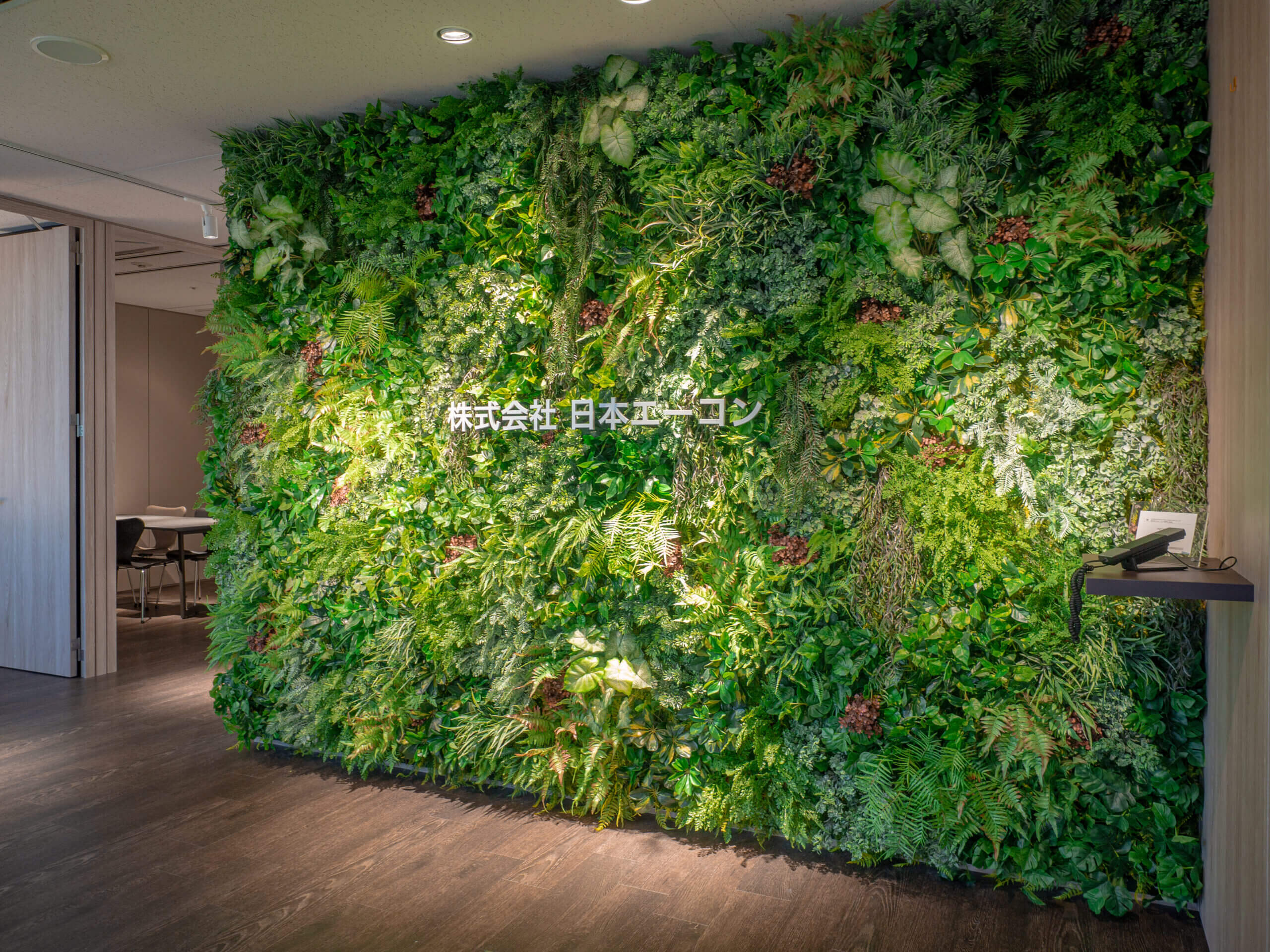 エントランス壁面は、正面を立体的なグリーンウォールと致しました。サインはステンレス素材にすることでグリーンに溶け込みながら、上品な仕上がりとなりました。高級感を表したいというお客様のご要望を受け、当初の想定から植栽やサインの仕様変更をご提案させていただき、洗練された質感と自然の調和が感じられる理想的なエントランスにすることができました。