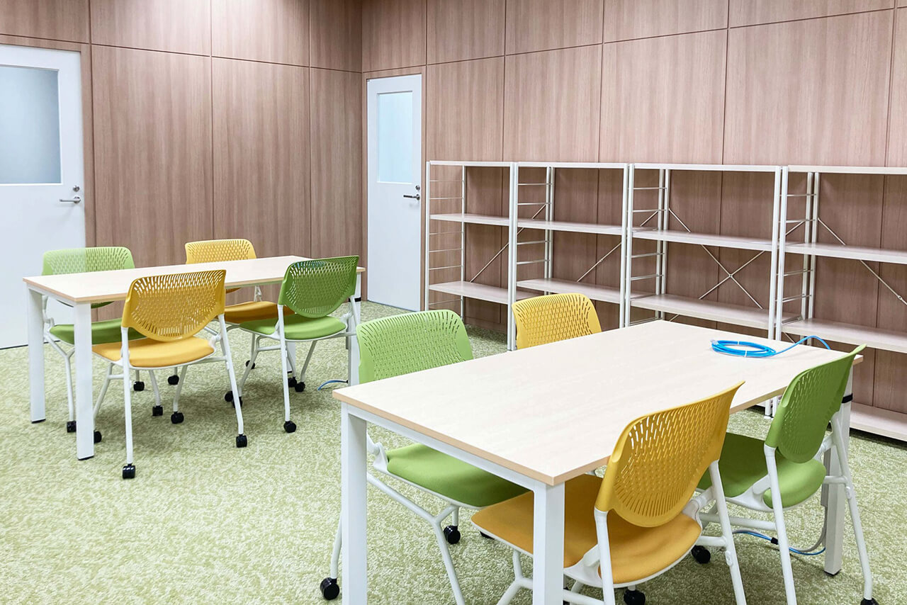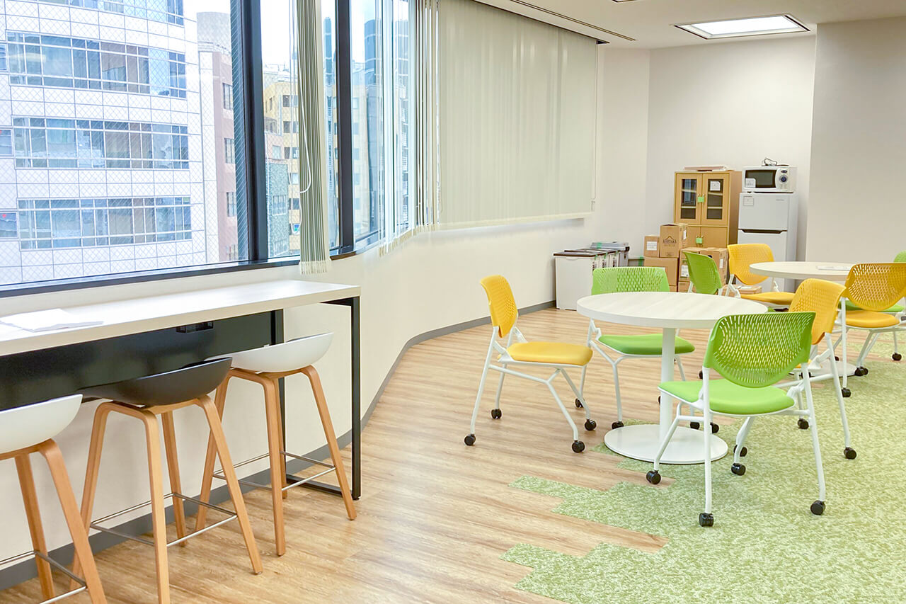 グリーンや木目調などのアースカラーを取り入れることで執務空間から心機一転、リフレッシュの空間として利用できるようにデザインを考えました。また、丸テーブル以外にハイカウンターなども設置し、ゆったりとした空間の中でカジュアルに会話ができる空間になりました。