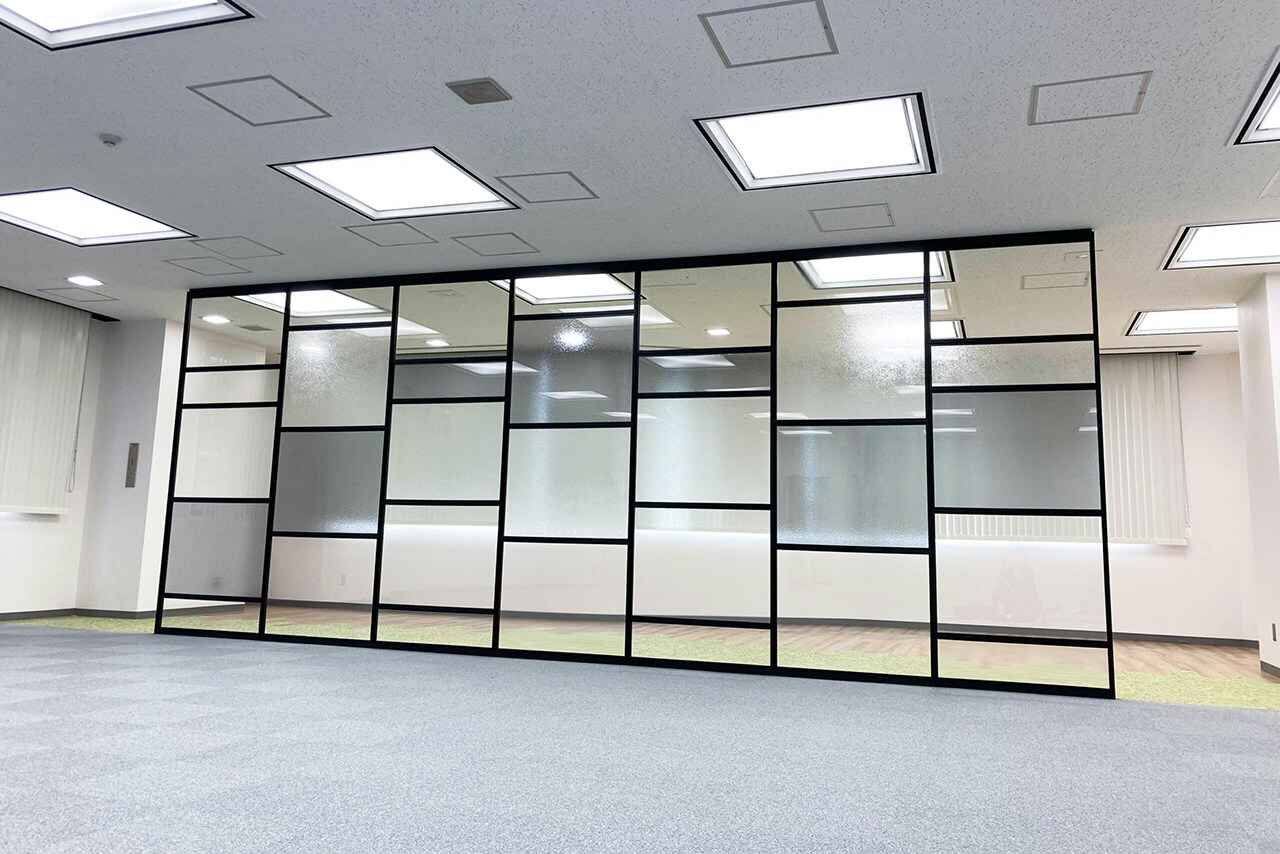 また執務空間とカフェを隔てる間仕切りは少し特徴的で透け感のあるガラスの商品を採用しました。扉を無くすことにより、執務空間との完全に隔離することなく、ゆったりとつながりを持たせることができました。執務空間がカフェと緩やかにつながることで、一体感も生まれる空間になっております。ご挨拶にお伺いした際、すでにリフレッシュスペースを多くの方が使用されており、嬉しく思いました。