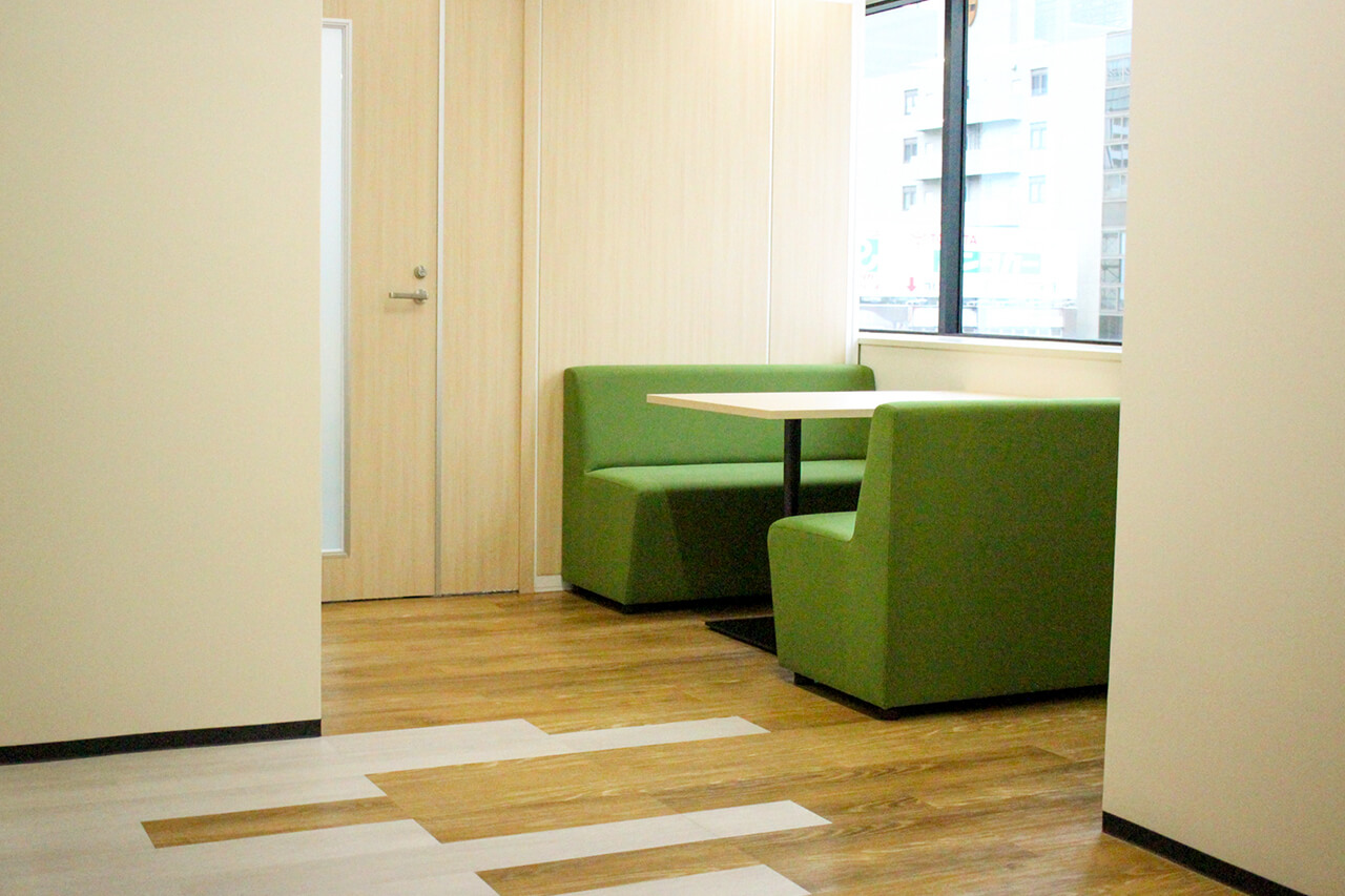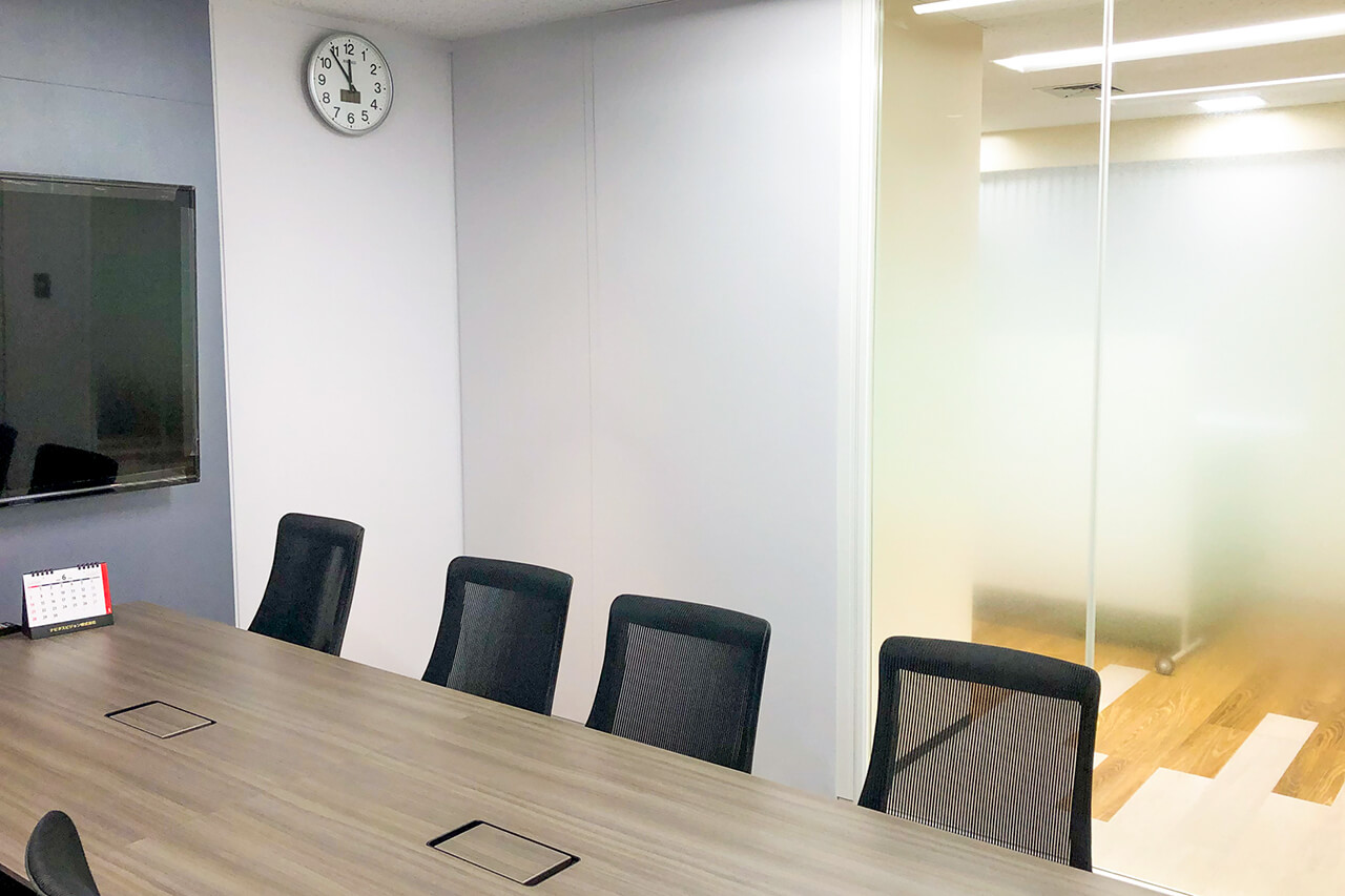 エントランスからアクセスするメインの来客会議室は、高級感を感じさせるお部屋の仕様で家具類と合わせて空間つくりをするとともに、特徴的にガラスを大きく設計した窓面からの採光を十全に生かして、個室内へ自然光の明るさを取り入れました。