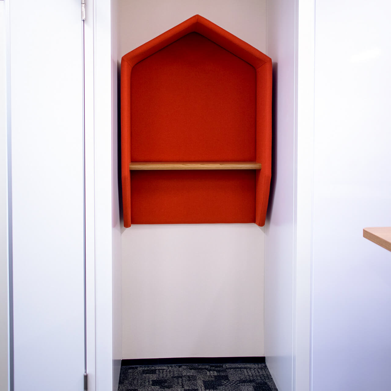 エントランスは会社の顔になるスペース、シンプルでも安っぽくならないようライティングやコーポレートカラーを差し色に入れるといった工夫を施し、奥の窓に向かってナチュラルな床の張り分けを行うことで単調になりすぎない配慮もおこないました。