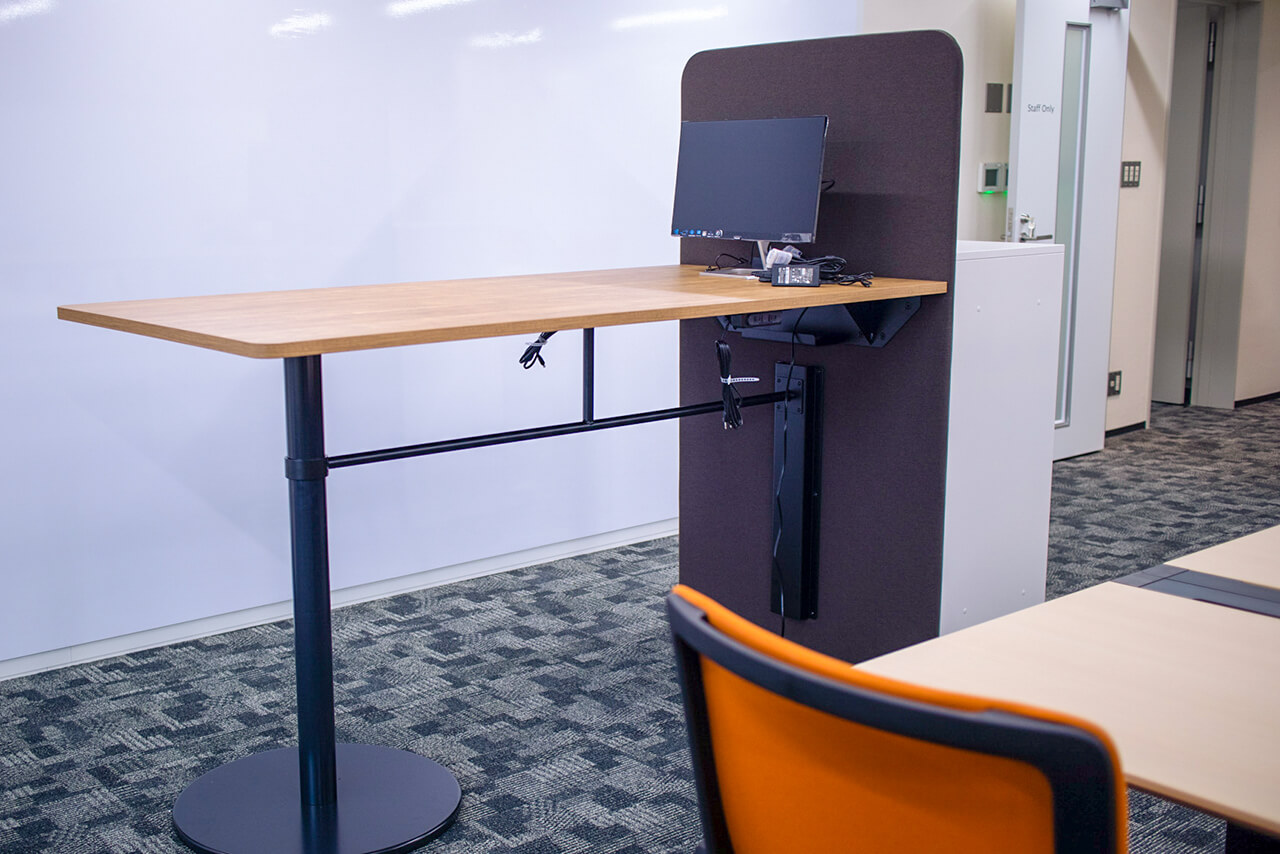 座席はABW(Activity Based Working)の考え方を軸に、一般的なフリーアドレスデスク、固定席、フォーンブース、オープンミーティング、スタンドテーブル、打合せ兼集中作業のソファブース席、と多種多様なタイプを用意し、常勤者にとっては働きたい場所を自分で選択できるオフィスを実現しました。