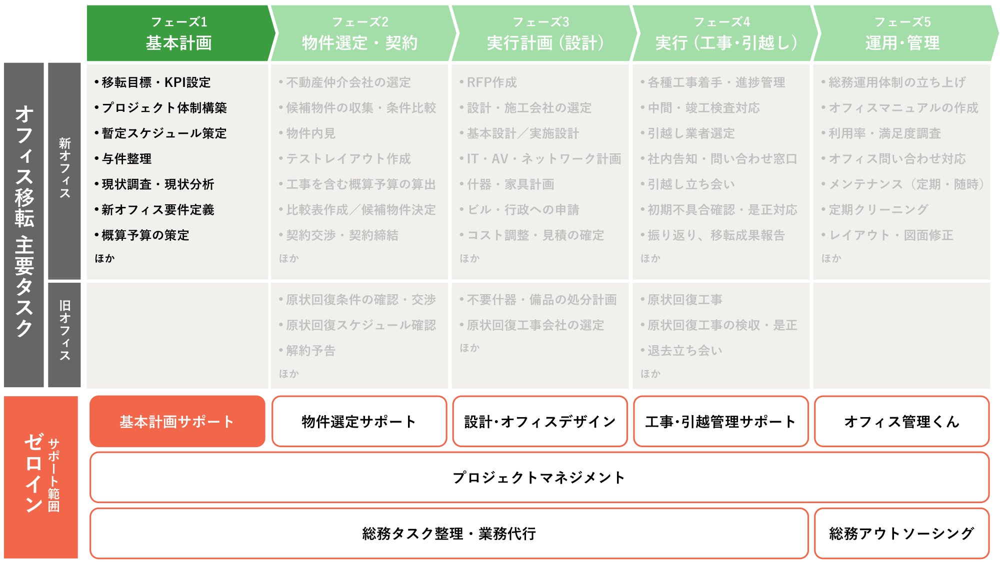 オフィス・事務所の​業務経験が​なくても、​具体的な​検討・判断が​できる​状態を​整える​「基本計画」​サポートです。​目的や​優先順位を​言語化し、​オフィス利用度調査や​現場インタビュー・​調査から​課題を​整理したうえで、​適切な​オフィス規模・物件条件、​概算予算、​スケジュール骨子、​体制・意思決定フローまでを​設計します。​物件選定に​入る​前の​前提情報を​整え、​後戻りや​手戻りを​防ぐ​検討の​土台を​構築します。​
